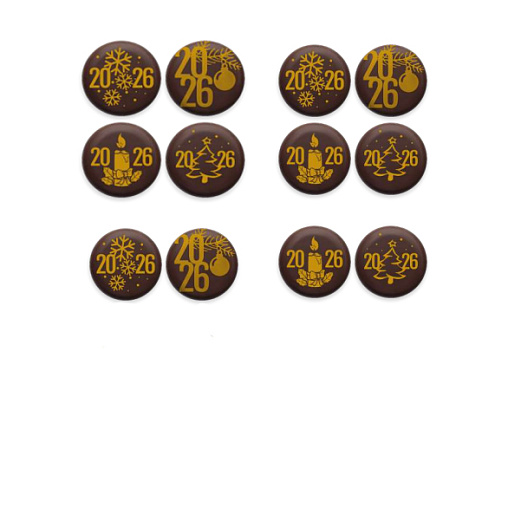 Ассорти медальонов "2026"с четырьмя различными принтами. Идеально круглые, тонкие, с шоколадным вкусом. Украшение впишется в любую выпечку, кондитерские изделия и десерты новогодней тематики.