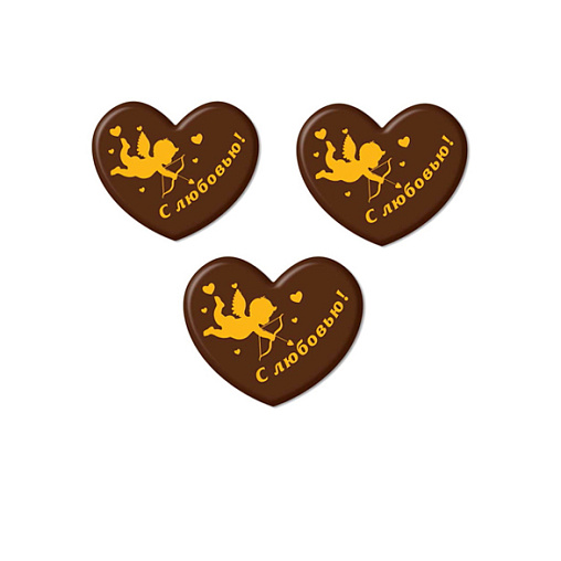 Шоколадные сердечки с надписью “С любовью!” и рисунком в виде ангелочка, стреляющего из лука, для самых искренних и волшебных моментов Дня Влюбленных и подобных мероприятий..